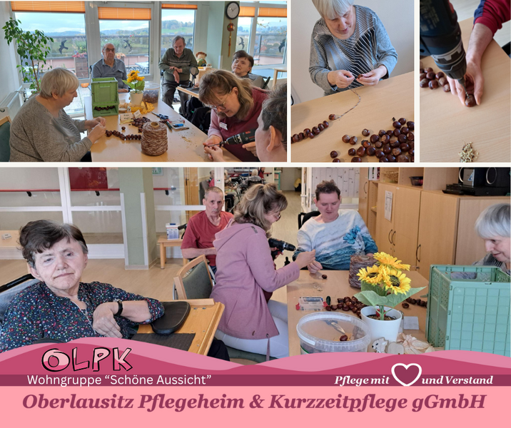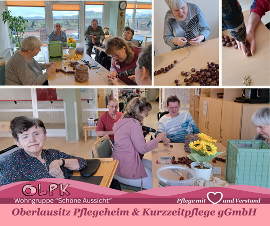 Der Herbst hält Einzug und mit ihm die bunte Vielfalt der Natur. In gemütlicher Runde wurde auf der Wohngruppe „Schöne Aussicht“ gemeinsam gebastelt. Dabei wurden alle kreativ und es entstanden schöne herbstliche Dekorationen aus Kastanien und Naturmaterialien für den Wohnbereich.