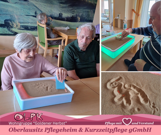 Kreative Stunden auf der Wohngruppe „Goldener Herbst“ des Seniorenwohnhauses „Am Belmsdorfer Berg“. Mit buntem Licht, warmen Sand und viel Fantasie sind wunderschöne Bilder entstanden. Unsere Senioren ließen ihrer Kreativität freien Lauf.