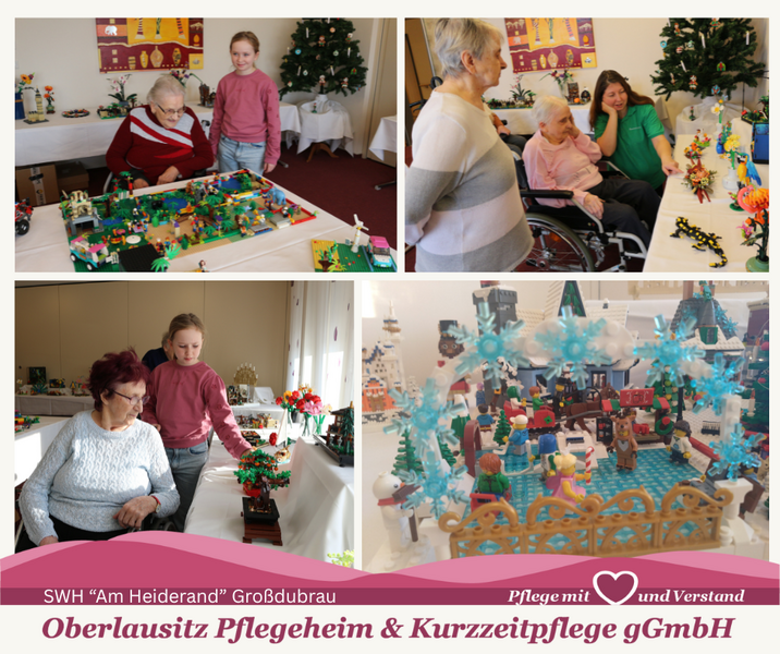 Eine kunterbunte Ausstellung gab es am Wochenende im Seniorenwohnhaus „Am Heiderand“ Großdubrau zu sehen: Der sechzehnjährige Jannis aus Quatitz stellte uns einen Teil seiner Lego-Ausstellungstücke zur Verfügung. Gemeinsam mit anderen Bauwerken von Kindern unserer Mitarbeiter entstand eine bunte Welt aus tausenden von kleinen Bausteinen: es gab Blumen, die Osterreiter, eine Winter- und Weihnachtsstadt, eine Legostadt mit Zoo, ein Aquarium und vieles andere mehr. Die Bewohner waren nicht nur von dem schönen Anblick fasziniert, nein sie schätzten auch die viele Arbeit und Mühe die darin steckt. Viele Bewohner erzählten auch von eigenen Erfahrungen mit den kleinen, bunten Steinen. „Das habe ich mit meinen Enkeln auch gemacht“, so eine Bewohnerin. Wir danken allen für den schönen Vormittag und sind gespannt was vielleicht das nächste Mal gebaut wird.