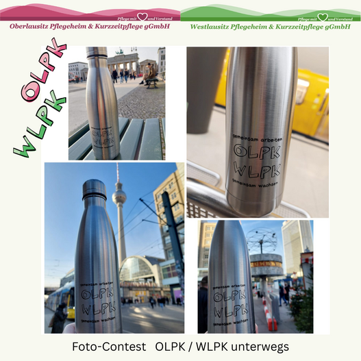 "Unsere Trinkflasche geht auf Reise"... In Zusammenarbeit mit der Geschäftsleitung hat die AG Gesundheit zu einem Mitarbeiterfotowettbewerb aufgerufen. Das Weihnachtsgeschenk, die Trinkflasche der OLPK und WLPK, soll in Szene gesetzt werden, ganz gleich ob im Urlaub, auf Konzerten oder Wanderungen, Hauptsache sie ist mit unterwegs. Wir freuen uns auf ein spannendes Jahr mit zahlreichen Fotos.
